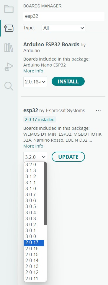 To do so, click on Tools > Board > Boards Manager…, search for the esp32 boards manager by Espressif Systems, and install version 2.0.17.